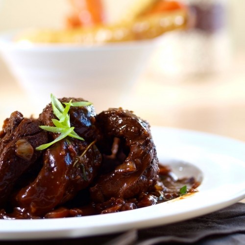 Teļa vaigi sarkanvīna mērcē ar garšaugiem