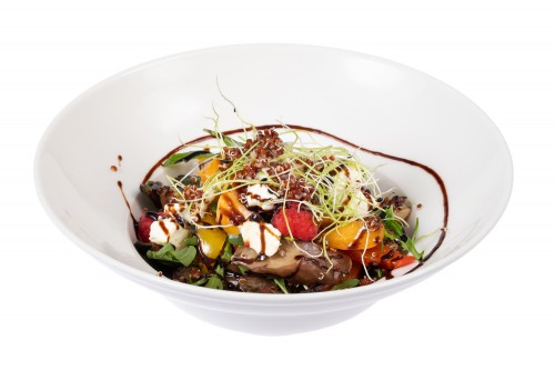 Grill salāti (baklažāns, cukini, cherry tomāti, persiki) ar kvinoju, kazas sieru, pesto