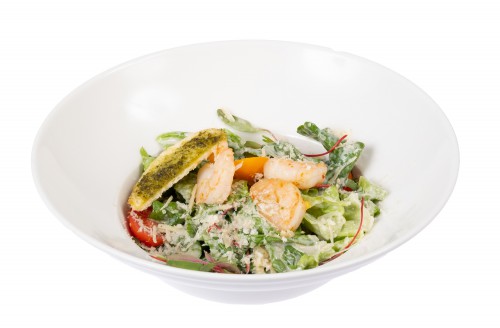 Klasiskie cēzara salāti ar grilētu vistas krūtiņu vai bekonu, cieto sieru, grauzdiņiem