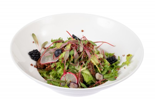 Svaigie frisē lapu salāti ar vītinātiem tomātiem, seleriju, vīģēm, gurķi, kvinoju, citrusa-medus mērci
