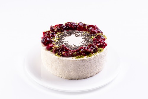 Baltās šokolādes musa kūka ar mandeļu biskvītu un ķiršiem