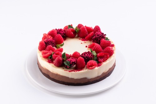 Šokolādes siera kūka ar kraukšķīti un avenēm