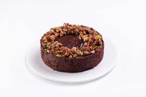 Šokolādes siera kūka ar kraukšķīti un avenēm