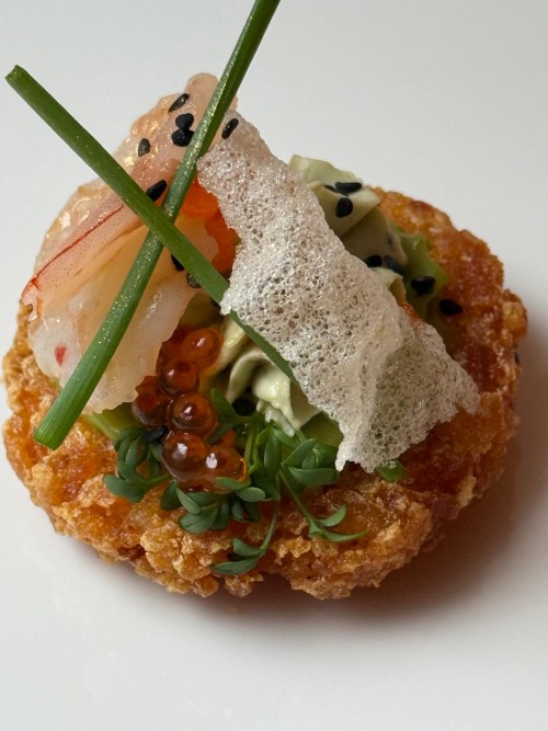 Kartupeļu rosti ar avokado musu, garšaugu krēmu un tīģergarneli