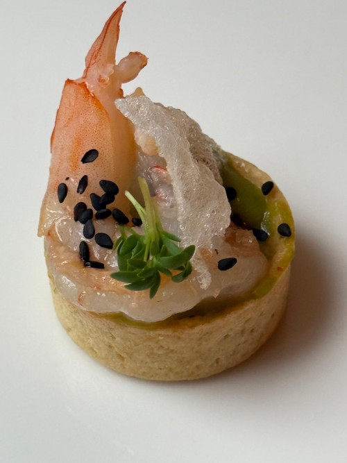 Kviešu groziņš ar avokado musu, tīģergarneli