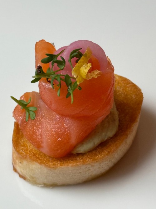 Lašmaizīte ar krēmsieru, marinētu sarkano sīpolu, citronu un dīgstiem