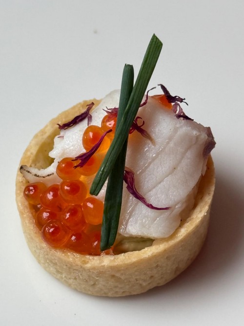 Kartupeļu rosti ar kūpinātu lasi, paipalu olu, kaviāru, krēmsieru, wakame